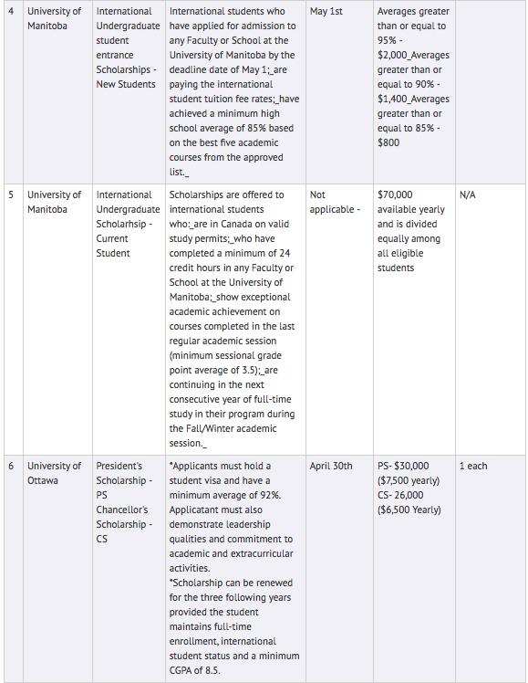 We have researched and brought together a list of top scholarships for international students in Canada. The main focus of this research is on schools that have scholarships designated for international students not just scholarships that are open to all students. These scholarships are based on academic merits, with most of them requiring averages of 90% and above. Some of them require students to apply for them while others are automatic (i.e students are considered for them when the apply to the universities or based on their grades after the first year). There are a number of schools with entrance scholarship as well as continuing scholarships for international students.